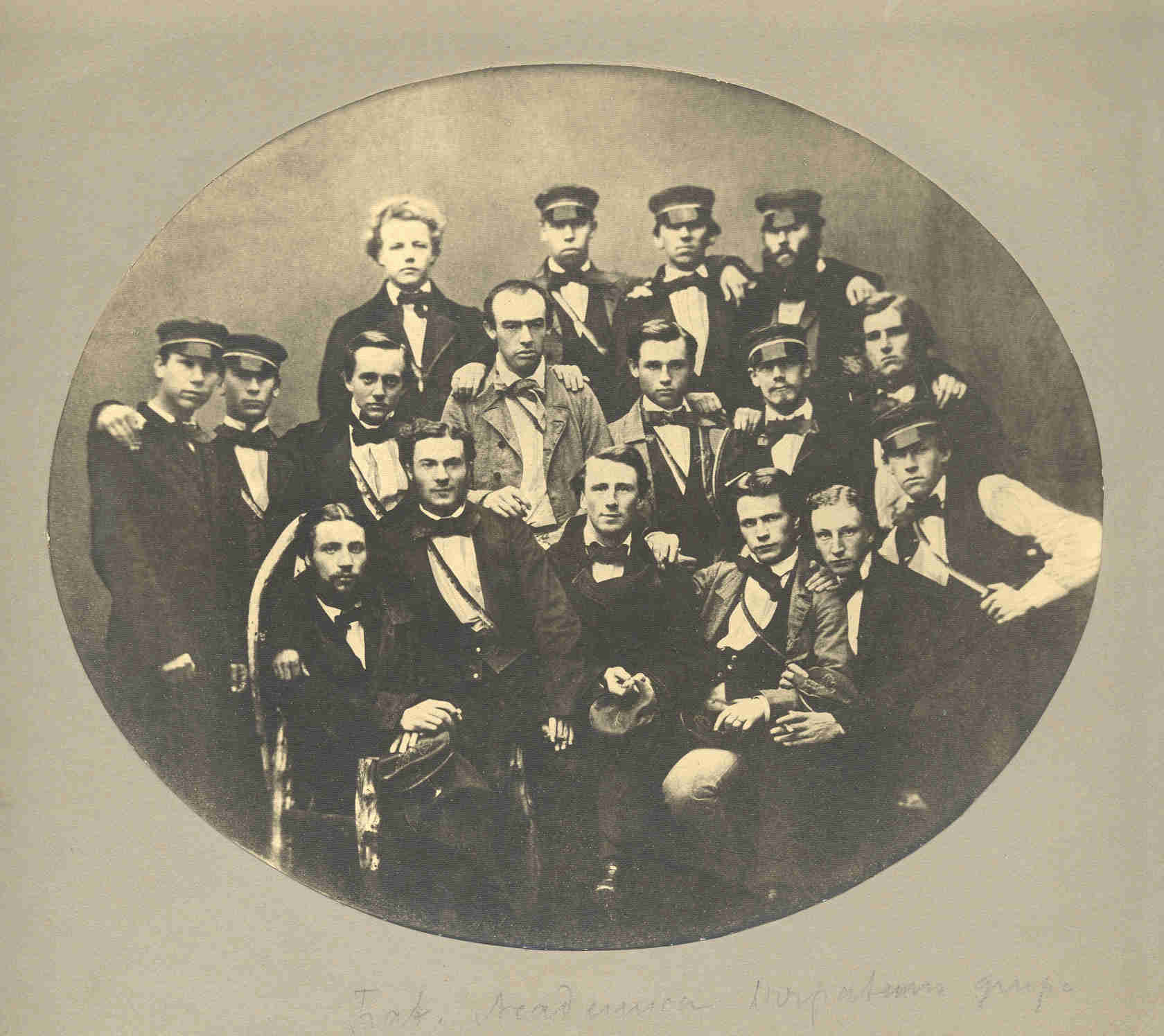 Korporācijas biedru grupa ar dzejnieku Juri Alunānu (1832-1864), kurš Tērbatas Universitātē studējis 1856-1861, kas arī ir fotogrāfijas oriģināla tapšanas laiks.