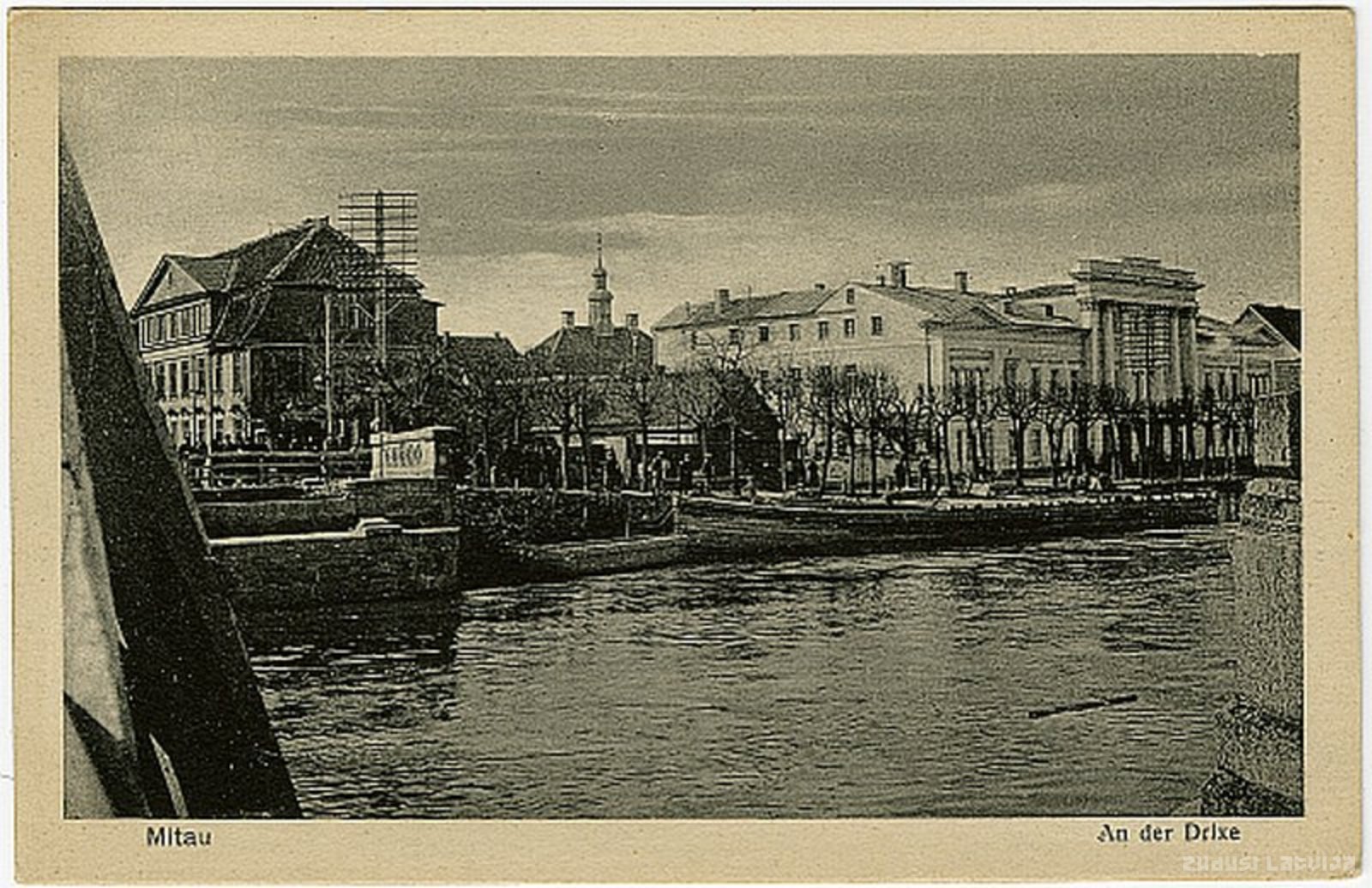 Atklātnes labajā malā Kurzemes bruņniecības nams. No 1922. līdz 1938.gadam tur atradās Jelgavas II valsts ģimnāzija