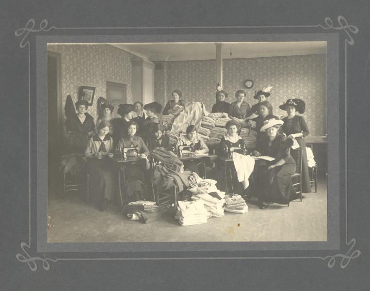 Latviešu strēlnieku organizācijas komitejas organizētā veļas šūšanas darbnīca strēlniekiem.