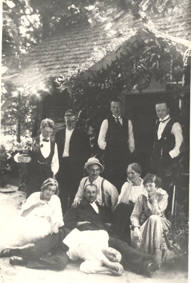 Mūzikas mākslinieki pie komponista Kārļa Kažociņa (1886-1920) lauku mājās Plāteres "Lielūžos" 1914. g. rudenī. Redzami: Jānis Mediņš, Miķelis Kažociņš, Celmiņš, Ed. Miķelsons, Ed.Kažociņš, Trīne Kažociņa, Ada Benefelde.