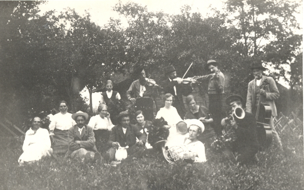 Komponists Kārlis Kažociņš (1886-1920) un viņa ģimenes locekļi kopā ar Mildu Lasmani un citiem līgotājiem Plāteres "Plaužos"