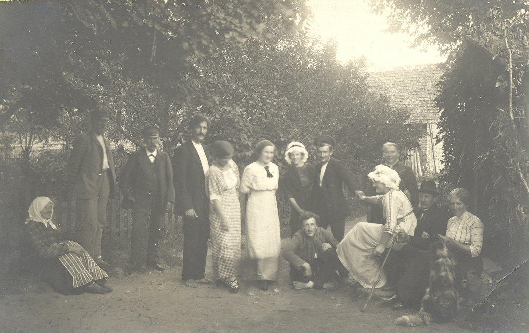 Redzami brāļi Eduards, Jānis un Kārlis Kažociņi, viņu vecāki, Kārļa sieva Emija, Jaunozoliņa no "Veccaunēm", skolotāji un kaimiņi pie Kažociņu mājām Plāteres "Lielūžos" 1913.g.