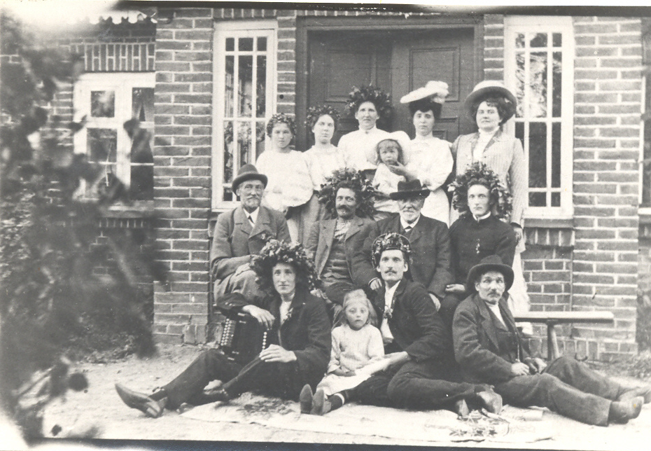 Mūziķi Eduards un Kārlis Kažociņi, viņu brālis Jānis, vecāki kaimiņu mājās "Plaužos" 1909.g. jāņos.