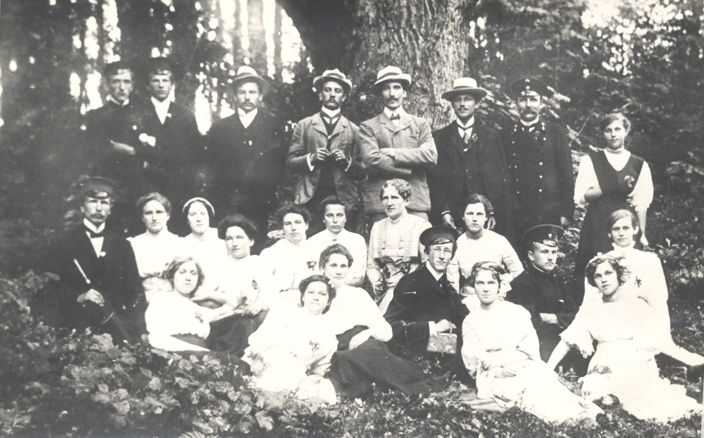 Redzami brāļi mūziķi Eduards, Jānis un Kārlis Kažociņi, Kārļa sieva Emija, Milda Lasmane un viņas māsa.