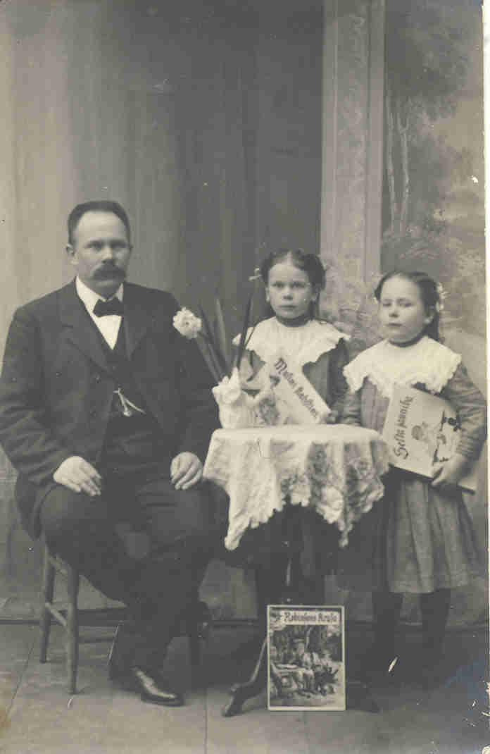 Skolotājs E.Auka (1871-1950.gadi) strādājis par skolotāju Valmierā, Veselavā un Raunā. Meitenēm rokās redzamās grāmatas dāvinājusi krustmāte, rokdarbniece Elaza Jende.