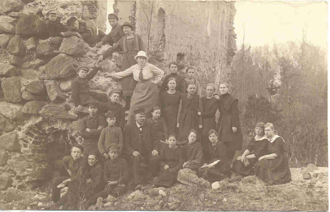 Skolēnu ekskursija Raunas pilsdrupās ar skolotāju Eduardu Auku (1871-1950.gadi).Strādājis par Raunas pagastskolas skolotāju no 1908.g.