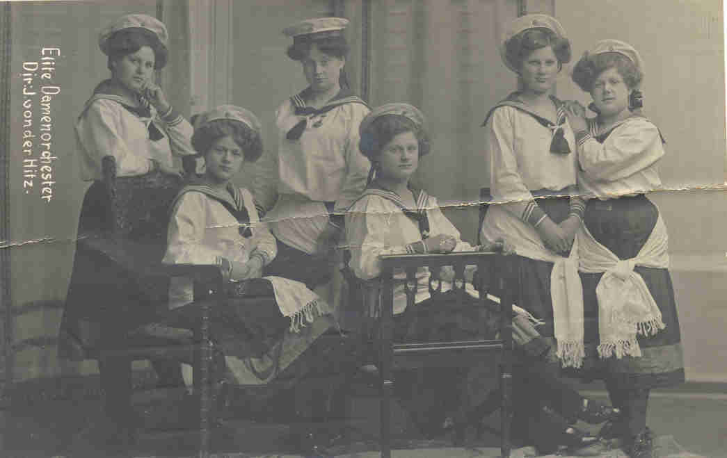 Veltījuma uzraksts Jānim Putniņam ar ziņām par to,ka fotogrāfiju viņam un biedriem dāvinājušas viesnīcas "Metropole" pūtēju orķestra dalībnieces. Spiedogi "Niemeyer Hauptpost" un "Elite Damenorchester. Dir. J. von der Hitz".