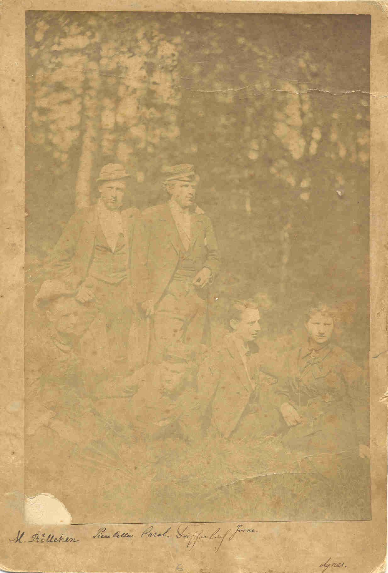 Ar atzīmēm par redzamajām personām: priekšā no kreisās M.Rollhena, 3.-Jāzeps Vītols, 4.-J.Vītola māsa Agnese, 2.rindā stāv no kreisās Nikolajs Alunāns un D. Krauksts.