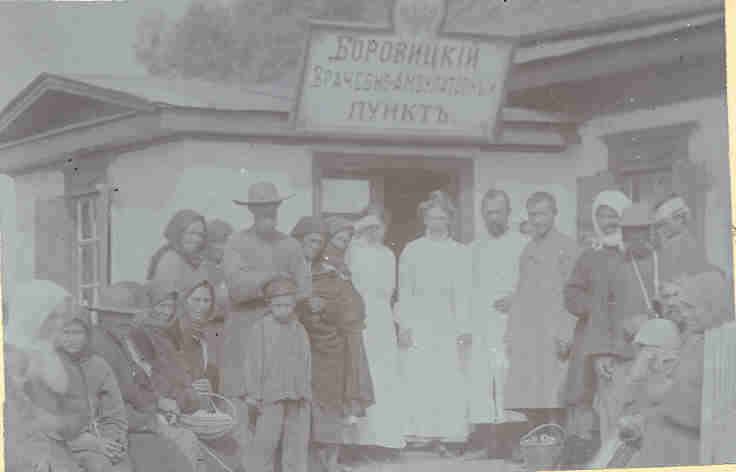 Cilvēku grupa pie Borovickas medpunkta., Ārsts