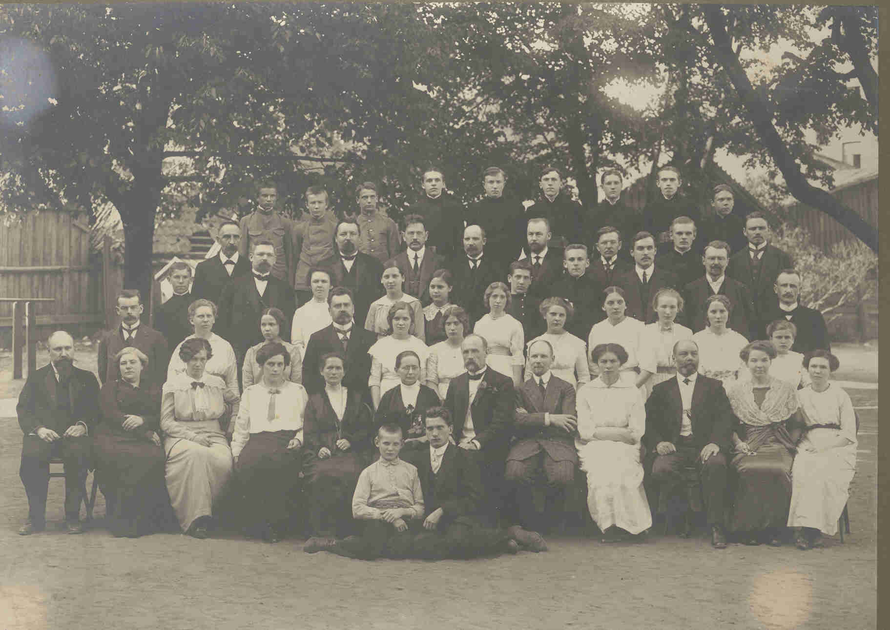 Pedagoga un literāta Kārļa Dēķena (1866-1942) darba jubilejas (1889-1914)dalībnieki 1914.g.1.jūnijā Rīgā, Skolotāju Sabiedrības Tirdzniecības skolā.