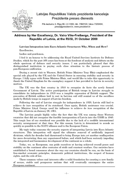 Address by Her Excellency, Dr. Vaira Vike-Freiberga, President of the Republic of Latvia, at the RUSI, 31 October 2000