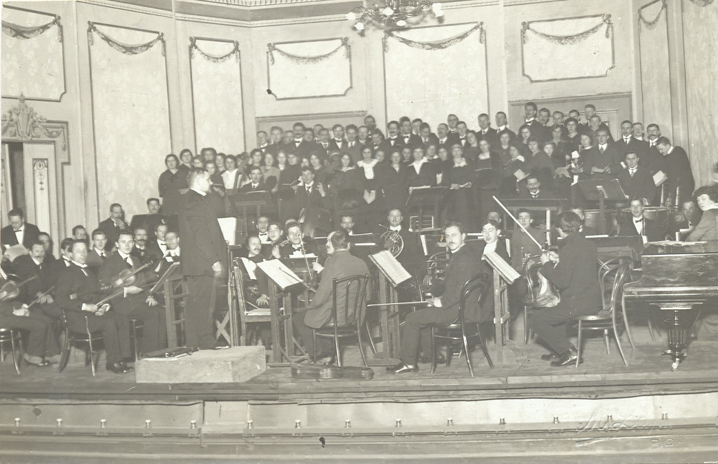 Redzami: diriģents Erdmanis, blakus Hiršvics, Surkevičs, Liniņš, Bērziņš, Freimans, Fūrmans, K.Paucītis, Tofler, Neimans, Jāz.Mediņš, Dalīts, Cimmers, Beders, Bērziņš, Valle, Martinovičs?, Tunts, Drila, Stiebriņš, Jurjāns, Freidenfeld