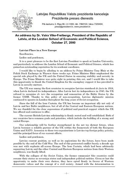 An address by Dr. Vaira Vike-Freiberga, President of the Republic of Latvia, at the London School of Economic and Political Science, October 27, 2000