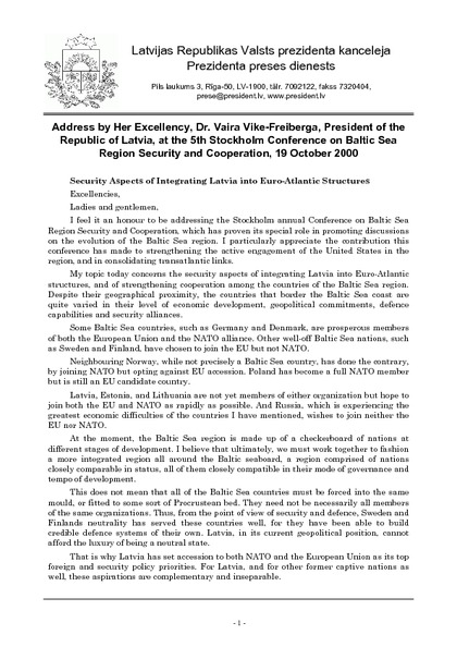Address by Her Excellency, Dr. Vaira Vike-Freiberga, President of the Republic of Latvia, at the 5th Stockholm Conference on Baltic Sea Region Security and Cooperation, 19 October 2000