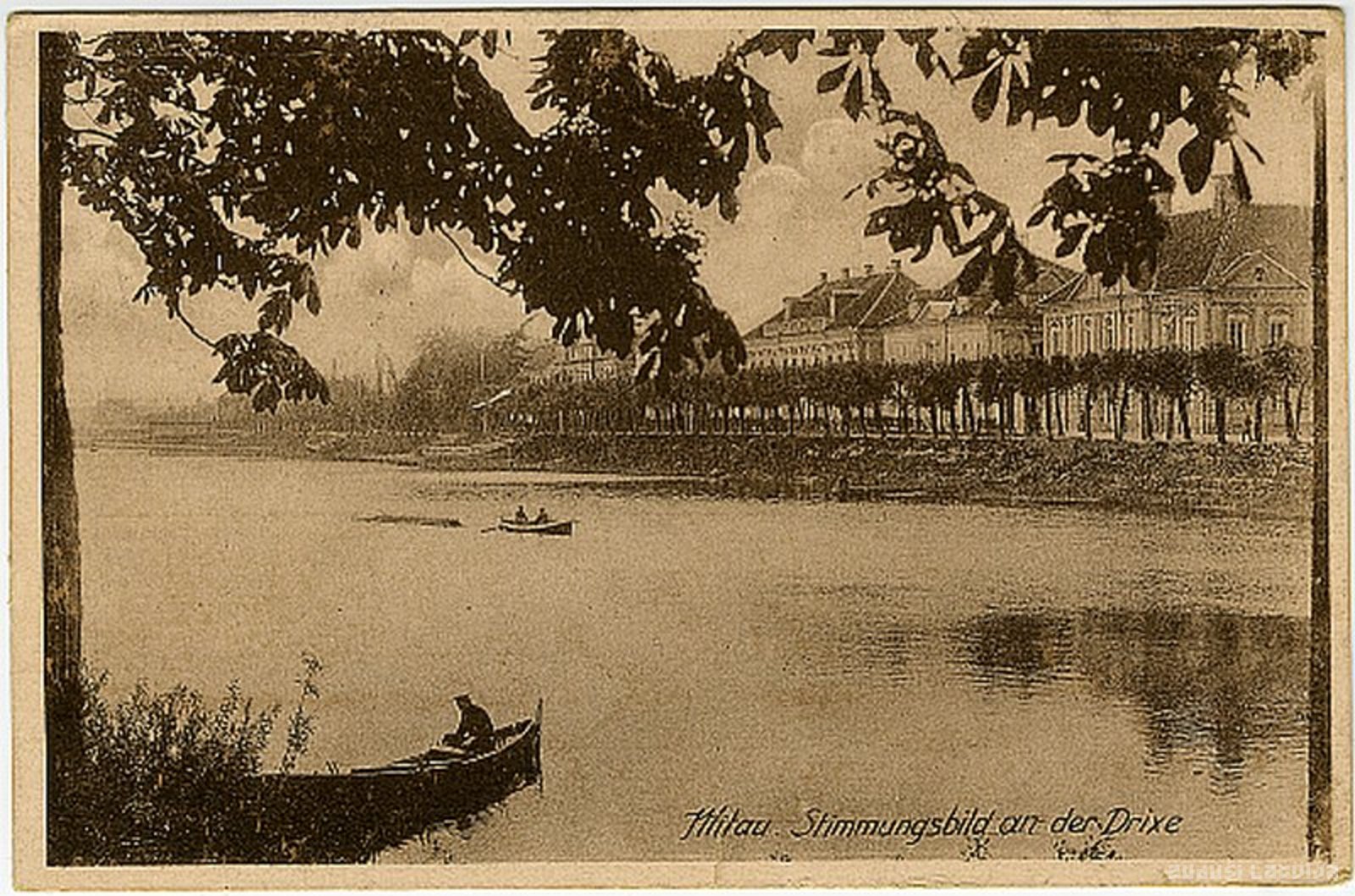 Jelgava. Skats uz ēkām Čakstes bulvārī, agrākā Upes ielā, Driksas krastā