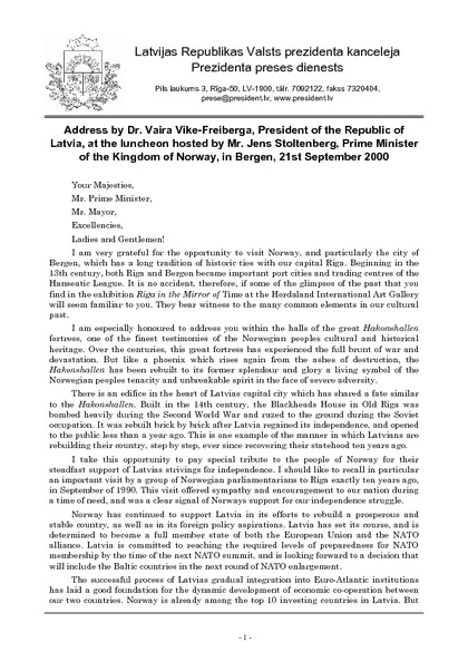 Address by Dr. Vaira Vike-Freiberga, President of the Republic of Latvia, at the luncheon hosted by Mr. Jens Stoltenberg, Prime Minister of the Kingdom of Norway, in Bergen, 21st September 2000
