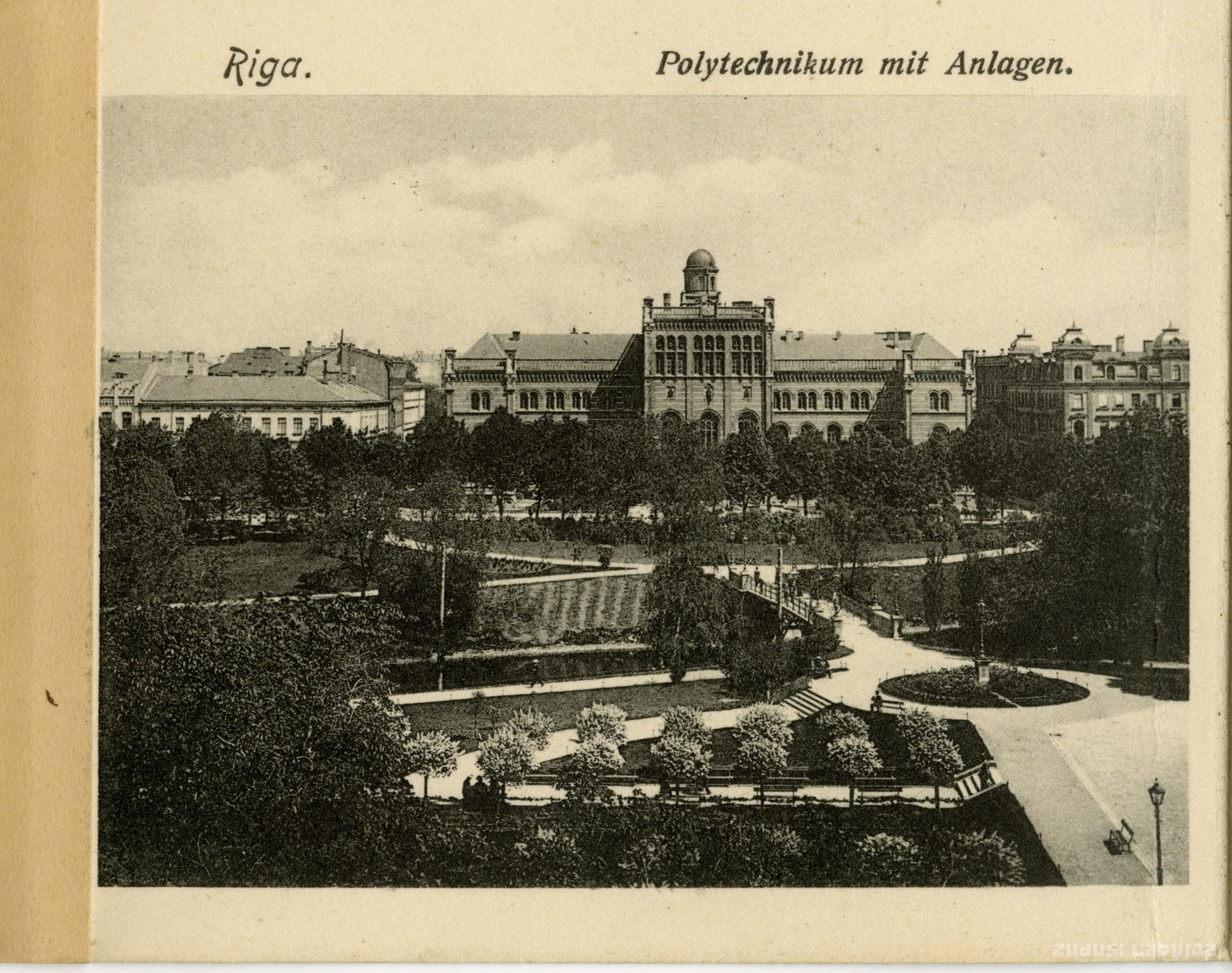 Rīgas Politehnikuma (tagad: Latvijas Universitāte) ēka tapa pakāpeniski. Pēc G. Hilbiga projekta cēla atzarojumus gar Raiņa bulvāri (1866. gads), Merķeļa ielu (1876. gads) un Inženieru ielu (1883. gads). Arhitektu ielas sānu korpuss - pēc arhitekta O. Hofmaņa projekta (1910. gads). Neoromānika. Priekšplānā - Timma tilts (1900. gads), ko cēla pēc inženiera Ivana Kropivjanska projekta