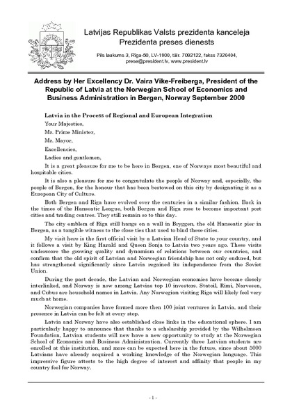 Address by Her Excellency Dr. Vaira Vike-Freiberga, President of the Republic of Latvia at the Norwegian School of Economics and Business Administration in Bergen, Norway September 2000