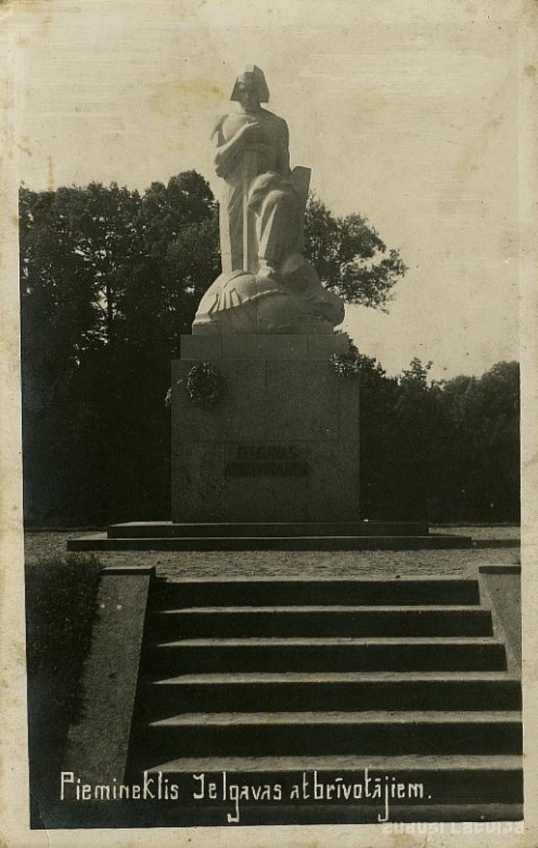 Piemineklis Jelgavas atbrīvotājiem tika atklāts 1932.gada 22.jūnijā. Tas bija Kārļa Jansona veidotais piemineklis "Lāčplēsis un Melnais bruņinieks". Pieminekli novietoja pie Stacijas laukuma, tas bija visai iespaidīgs - figūru tēlnieks cirtis 3,5 metrus augstā pelēkā granītā. Tā novietota uz zilganpelēkām granīta plāksnēm apšūta 3 metrus augsta postamenta. Kad vācieši okupēja Latviju, baronam fon Mēdemam, kas bija atgriezies Jelgavā, nepārprotamā simbolika nepatika. Bruņinieka veidols tika nokalts. Tā pārveidots, tas pārdzīvoja Jelgavas nopostīšanu Otrā pasaules kara laikā un stāvēja savā vecajā vietā vēl vairākus gadus pēc kara, līdz Staļina personības kulta laikā to novāca. Piemineklis tika ierakts, tā fragments pēc vairākkārtīgiem meklējumiem atrasts un 1988.gadā novietots pie Jelgavas vēstures un mākslas muzeja
