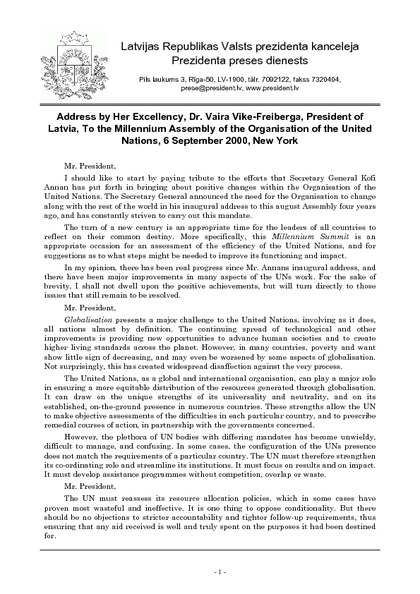 Address by Her Excellency, Dr. Vaira Vike-Freiberga, President of Latvia, To the Millennium Assembly of the Organisation of the United Nations, 6 September 2000, New York