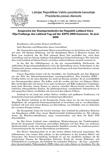 Ansprache der Staatspräsidentin der Republik Lettland Vaira Vīķe-Freiberga Am Lettland-Tag auf der EXPO 2000 Hannover, 30.Juni 2000