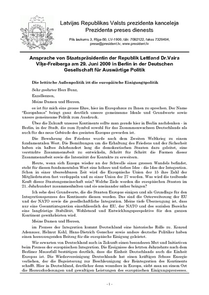 Ansprache von Staatspräsidentin der Republik Lettland Dr.Vaira Vīķe-Freiberga am 29. Juni 2000 in Berlin in der Deutschen Gesellschaft für Auswärtige Politik