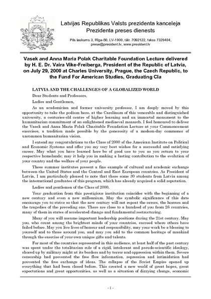 Vasek and Anna Maria Polak Charitable Foundation Lecture delivered by H. E. Dr. Vaira Vike-Freiberga, President of the Republic of Latvia, on July 29, 2000 at Charles University, Prague, the Czech Republic, to the Fund For American Studies, Graduating Cla