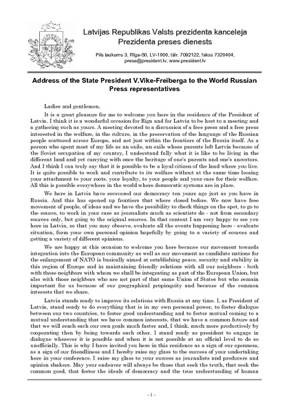 Address of the State President V.Vike-Freiberga to the World Russian Press representatives