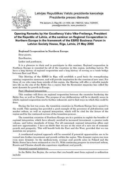 Opening Remarks by Her Excellency Vaira Vike-Freiberga, President of the Republic of Latvia, at the seminar on Regional Co-operation in Northern Europe in the framework of the EBRD Business Forum in Latvian Society House, Riga, Latvia, 21 May 2000