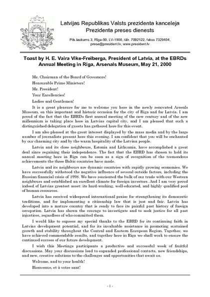 Toast by H. E. Vaira Vike-Freiberga, President of Latvia, at the EBRDs Annual Meeting in Riga, Arsenals Museum, May 21, 2000