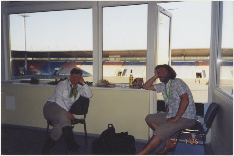 Jānis Ērglis un Jānis Purviņš IX Latvijas Skolu jaunatnes dziesmu un deju svētkos pēc mēģinājuma.