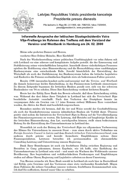 Informelle Ansprache der lettischen Staatspräsidentin Vaira Vīķe-Freiberga im Rahmen des Treffens mit dem Vorstand der Vereins- und Westbank in Hamburg am 24. 02. 2000