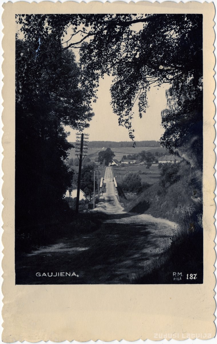 Skats uz Gaujienas ceļu un koka tiltu pār Gauju 1930. gados