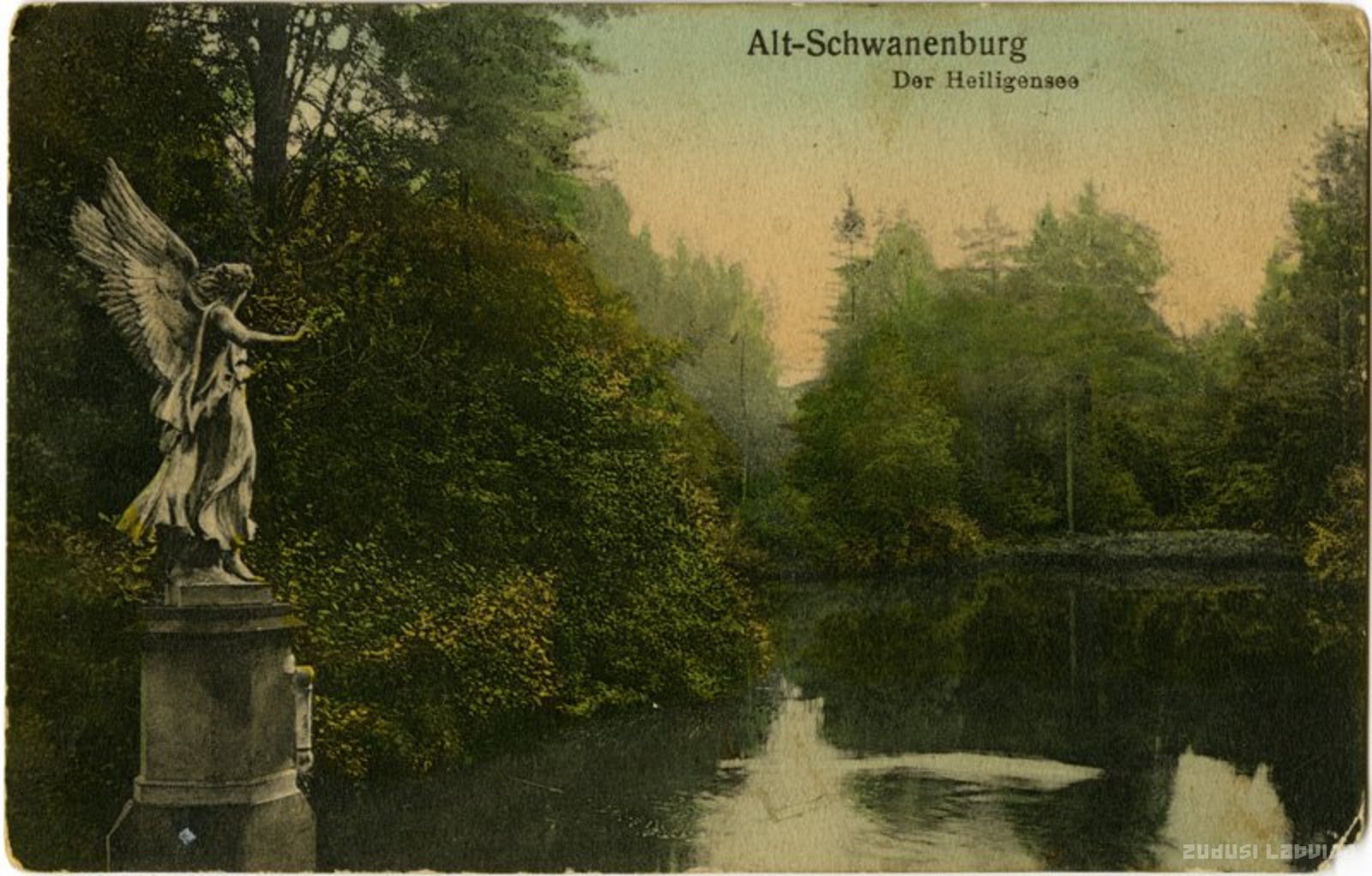 Atklātnes augšējā labajā stūrī uzraksts: "Alt-Schwanenburg. Der Heiligensee"