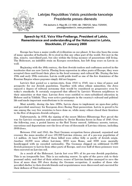 Speech by H.E. Vaira Vike-Freiberga, President of Latvia, Remembrance and understanding of the Holocaust in Latvia, Stockholm, 27 January 2000