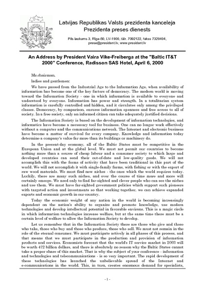An Address by President Vaira Vike-Freiberga at the "Baltic IT&T 2000" Conference, Radisson SAS Hotel, April 6, 2000