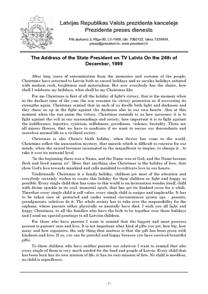 The Address of the State President on TV Latvia On the 24th of December, 1999
