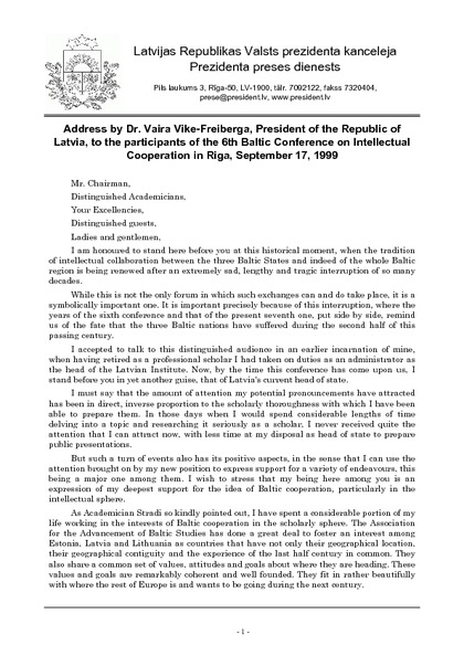 Address by Dr. Vaira Vike-Freiberga, President of the Republic of Latvia, to the participants of the 6th Baltic Conference on Intellectual Cooperation in Riga, September 17, 1999