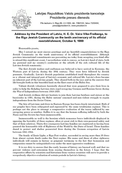 Address by the President of Latvia, H. E. Dr. Vaira Vike-Freiberga, to the Riga Jewish Community on the tenth anniversary of its official reestablishment, October 8, 1999