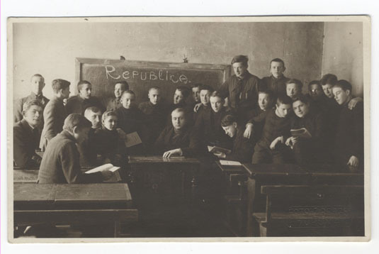 Tukuma pilsētas ģimnāzijas klase. Daži J. Plauža romāna "Ģimnāzisti" varoņu prototipi. Rakstnieks bija šīs skolas audzēknis. Uz tāfeles uzraksts "Republika" - tā saukuši klasi