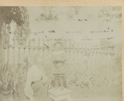 [Sieviete ar bērnu mājas pagalmā]