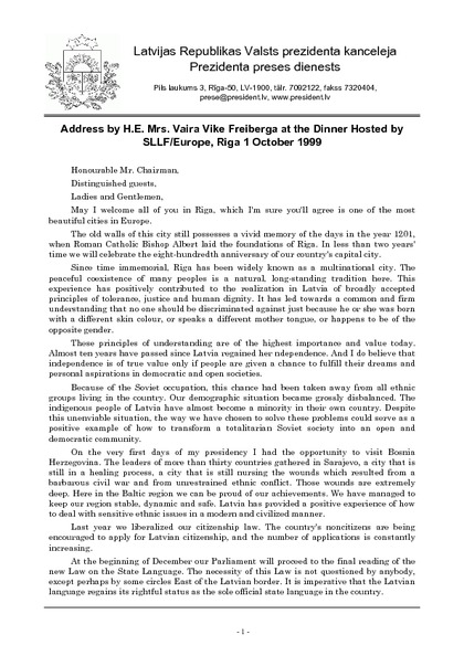 Address by H.E. Mrs. Vaira Vike Freiberga at the Dinner Hosted by SLLF/Europe, Riga 1 October 1999
