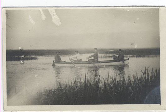 Vīriešu grupa ar bibliogrāfu Voldemāru Cauni laivā