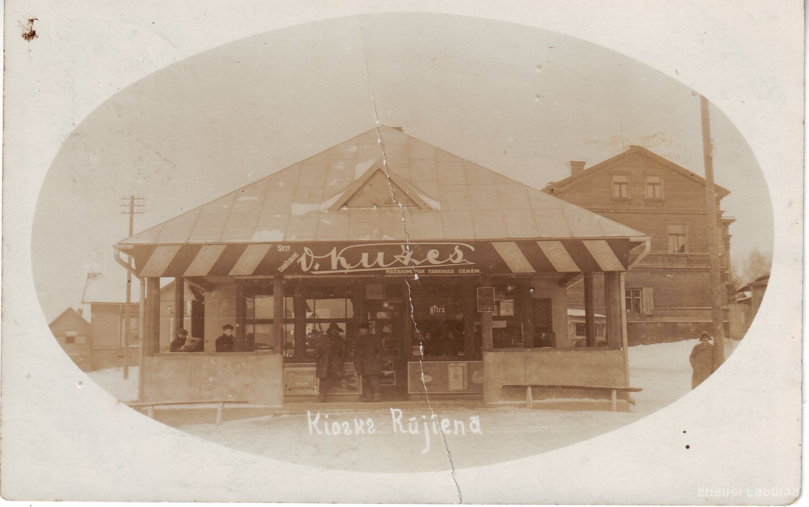 Kiosks Rūjienā 1933. gadā. Atradies pilsētas pašā centrā (šodien tur trijstūrveida zālājs). Nopostīts 1944. gadā