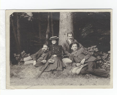 Sēņotāju grupa. Cīrihberga kalns. Šveice. Vidū sēž Klāra Hibšmane pirmā latviešu sieviete - ārste, sociāldemokrāte. No viņas pa kreisi Roberts Ivanovs (studējis Cīrihē), tālāk - Ručevskis no Līvbērzes. Otrā pusē - Šinga (?)