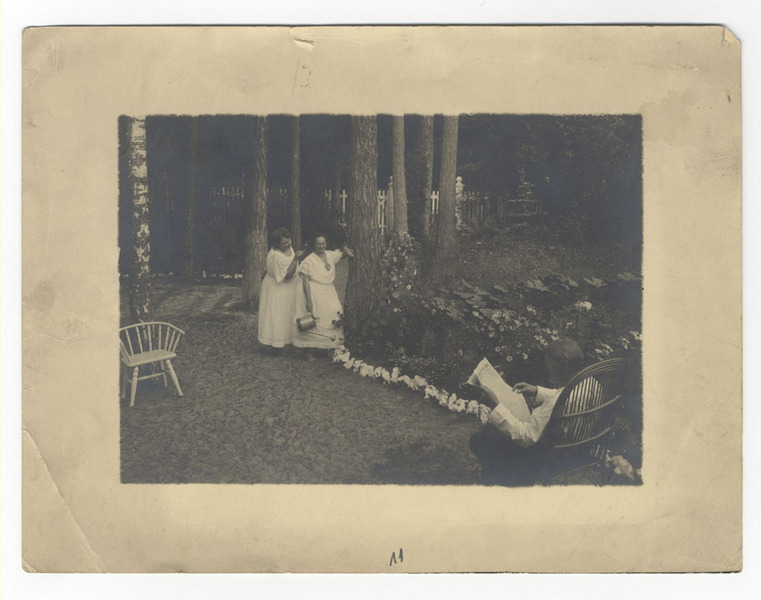 Olga Rīdzeniece kinoaktrise, fotogrāfa V. Rīdzenieka sieva un sociāldemokrāte. Klāra Hibšmane pirmā latviešu sieviete - ārste. Krēslā sēž Emīlis Skubiķis - Klāras Hibšmanes vīrs. Klāras