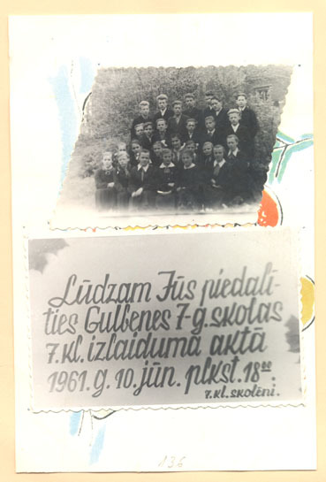 Ielūgums piedalīties Gulbenes 7 gadīgās skolas 7. klases izlaidumā uzlīmēts uz apsveikuma kartītes zem klases kopbildes