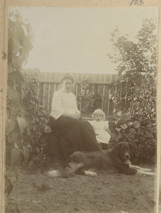Sieviete ar bērnu un suni mājas pagalmā