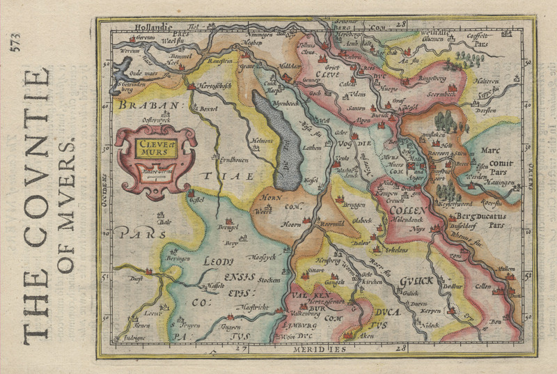 573. lpp. no G. Merkatora grāmatas. Lapas otrajā pusē lapas numurs "574", teksts ar nosaukumu "The Countie of Muers" angļu valodā