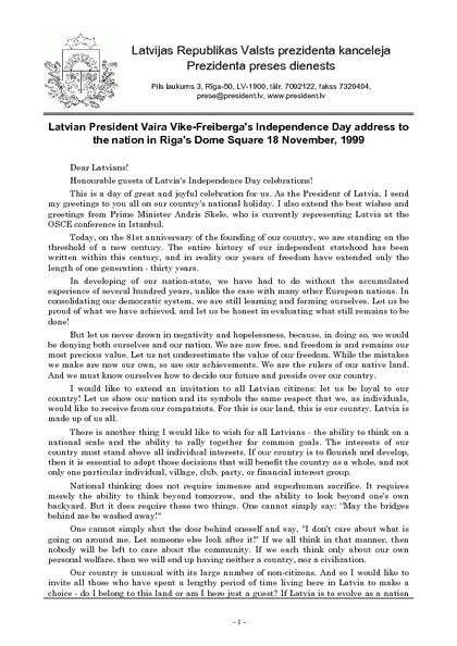 Latvian President Vaira Vike-Freiberga's Independence Day address to the nation in Riga's Dome Square 18 November, 1999